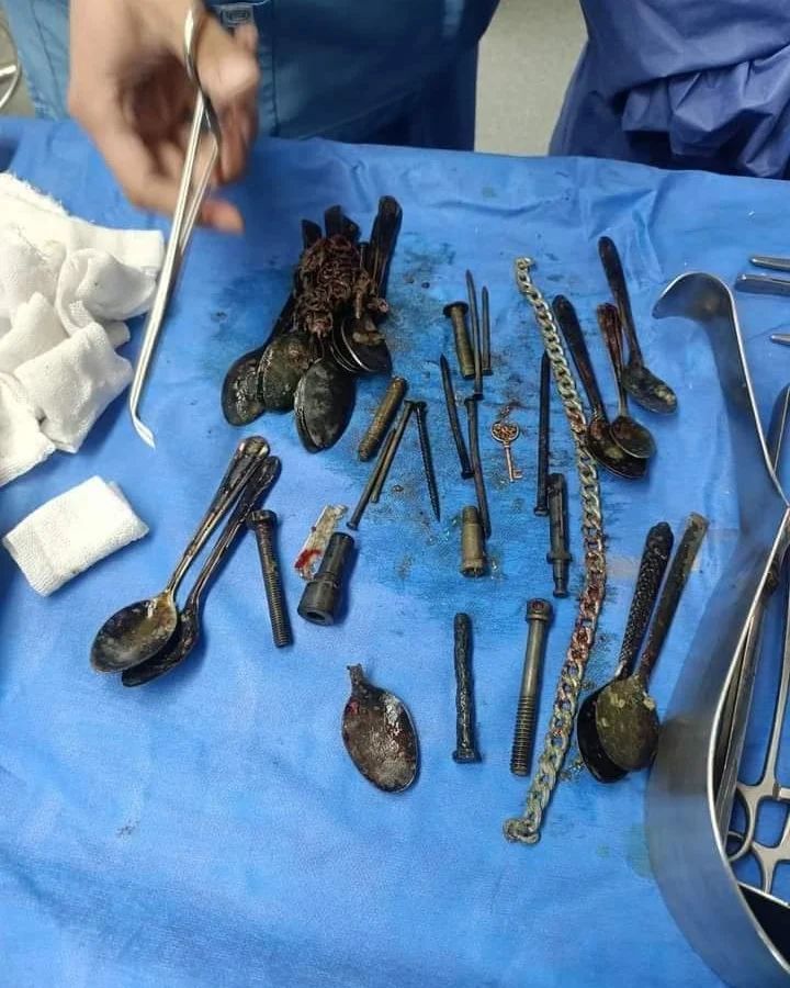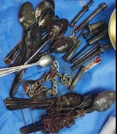 Медицинская бригада больниц Университета Мануфия успешно извлекла металлические предметы и маленькие ложки из желудка пациента. Отделение пищеварительной системы принял 45-летнего пациента, страдающего непрерывной тошнотой и сильной болей в верхней части живота. Заболевание не реагировало на лечение. Проведенное обследование показало наличие странных металлических предметов в желудке: